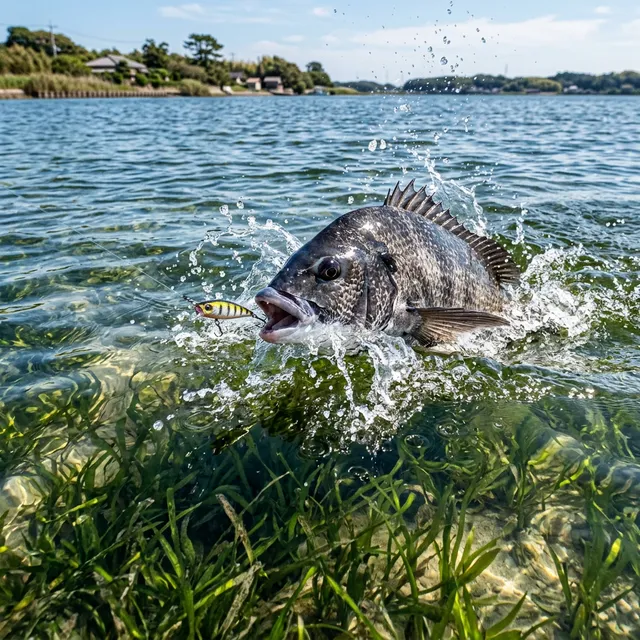 - シャローへの接岸: 水深30cm〜1mの極浅場にベイト(小魚)を追ってチヌが差してくる。
