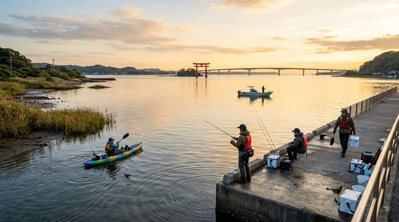 浜名湖の堤防で一際大きなタモ網を構え、ウキの動きに集中する釣り人たち。彼らが狙っているのは、浜名湖の王者「 クロダイ 」です。